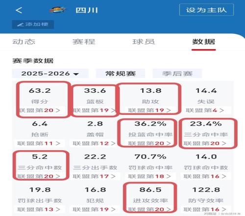 截止目前,四川隊(duì)在新賽季5戰(zhàn)皆墨。先后輸給廣州、青島、山東、南京和北京。5場比賽輸了136分,場均輸27.2分。同時(shí),球隊(duì)多項(xiàng)技術(shù)統(tǒng)計(jì),排名聯(lián)盟倒數(shù)1-2名。