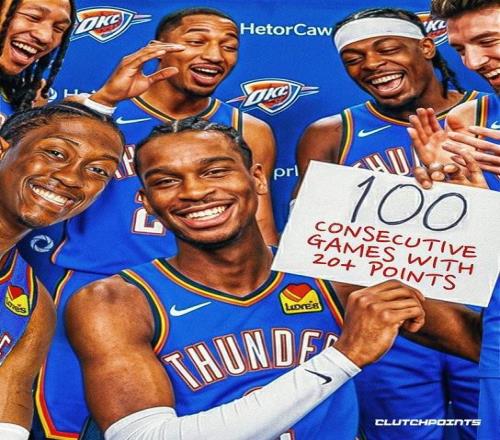 在比賽進(jìn)行到第四節(jié)的時(shí)候,雷霆當(dāng)家球星亞歷山大拿到了本場(chǎng)的第20分,這也是亞歷山大連續(xù)第100場(chǎng)比賽得分上20。