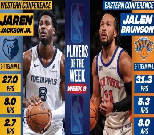 NBA官方公布了第9周的東西部周最佳球員,東部由尼克斯后衛(wèi)布倫森當(dāng)選,西部由灰熊中鋒JJJ當(dāng)選。布倫森上周場(chǎng)均砍下31.3分+5.3籃板+8助攻,帶領(lǐng)尼克斯隊(duì)取得2勝1負(fù)的戰(zhàn)績(jī)。據(jù)統(tǒng)計(jì)這是布倫森本賽季第2次當(dāng)選周最佳球員,也是生涯第9次獲此殊榮。JJJ上周場(chǎng)均貢獻(xiàn)27分+8籃板+2.7蓋帽,帶領(lǐng)無(wú)莫熊隊(duì)取得2勝1負(fù)的戰(zhàn)績(jī)。據(jù)統(tǒng)計(jì),這是JJJ生涯第2次斬獲該獎(jiǎng)項(xiàng)。除此之外,康寧漢姆、基迪、克尼佩爾、馬克西、懷特、阿夫迪亞、華子、喬治、亞歷山大和約基奇等球星獲得了周最佳提名。