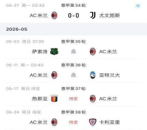 米蘭34輪后排名意甲第三,領(lǐng)先第五科莫6分,球隊(duì)接下來(lái)將在缺少莫德里奇的情況下?tīng)?zhēng)奪歐冠席位。