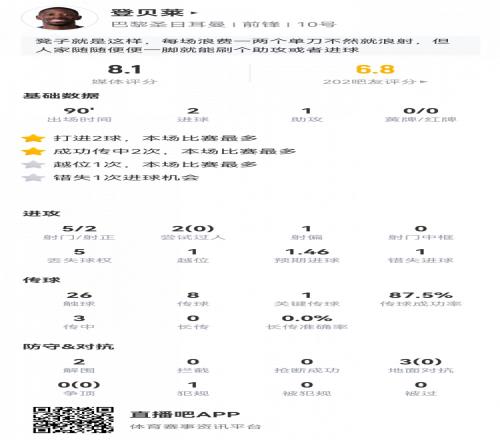 體育播報(bào)4月29日宣 歐冠半決賽首回合,巴黎5-4拜仁。登貝萊首發(fā)打滿全場(chǎng),球員全場(chǎng)重點(diǎn)數(shù)據(jù)如下↓