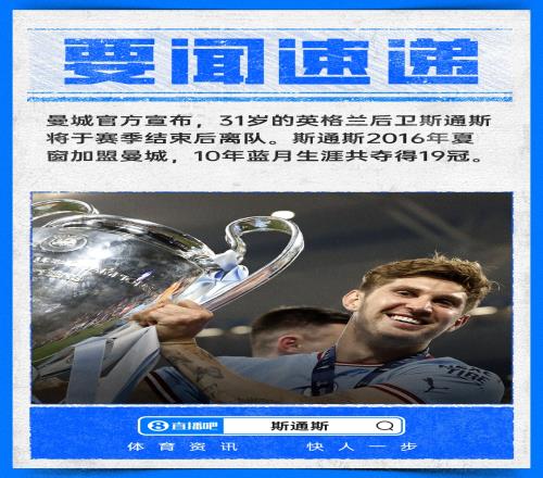 體育播報04月28日宣 曼城官方宣布,31歲的英格蘭后衛(wèi)斯通斯將于賽季結(jié)束后離隊。此前曼城已經(jīng)官宣隊長B席賽季末離隊。